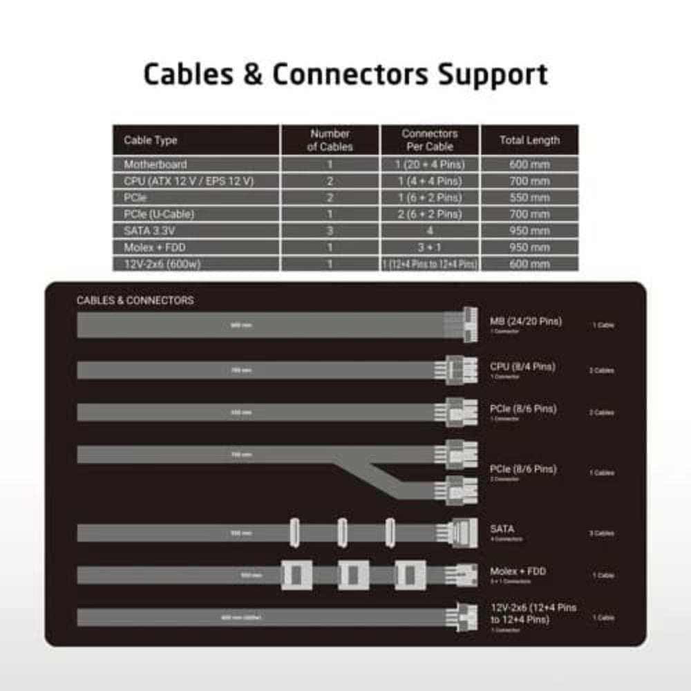 The XP-1000 has enough connectors for your new gaming PC or Workstation, along with 3x Molex and 12x SATA Power and 1x FDD Connectors 1. 1x 24-Pin ATX(Motherboard) Power (600mm) Cable 2. 2x 8(4+4)-Pin EPS(CPU) Power (650mm) Cables 3. 2x 8(6+2)-Pin PCIe Power (550mm), 1x 8(6+2)-Pin PCIe Power U-Cables 4. 1x 16(12+4)-Pin 12VHPWR (600mm) Cable