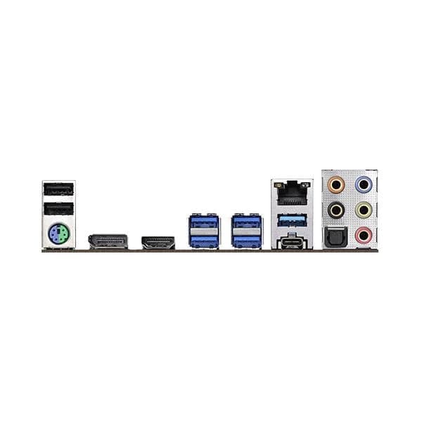 - 1 x PS/2 Mouse/Keyboard Port - 1 x HDMI Port - 1 x DisplayPort 1.2 - 1 x Optical SPDIF Out Port - 2 x USB 2.0 Ports (Supports ESD Protection) - 1 x USB 3.2 Gen2 Type-A Port (10 Gb/s) (Supports ESD Protection) - 1 x USB 3.2 Gen2 Type-C Port (10 Gb/s) (Supports ESD Protection) - 4 x USB 3.2 Gen1 Ports (Supports ESD Protection)* - 1 x RJ-45 LAN Port with LED (ACT/LINK LED and SPEED LED) - HD Audio Jacks: Rear Speaker / Central / Bass / Line in / Front Speaker / Microphone (Gold Audio Jacks) |