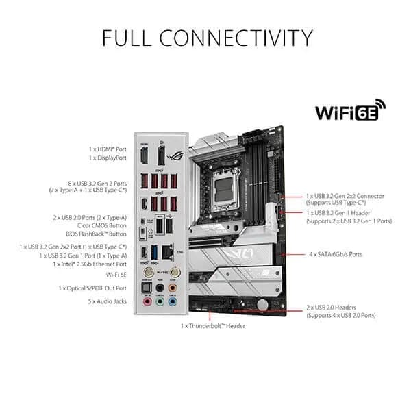 1 x USB 3.2 Gen 2x2 port (1 x USB Type-C®) 8 x USB 3.2 Gen 2 ports (7 x Type-A, 1 x USB Type-C®) 1 x USB 3.2 Gen 1 port (1 x Type-A) 2 x USB 2.0 ports (2 x Type-A) 1 x DisplayPort 1 x HDMI® port 1 x Wi-Fi Module 1 x Intel® I225-V 2.5Gb Ethernet port 5 x Audio jacks 1 x Optical S/PDIF out port 1 x BIOS FlashBack™ button 1 x Clear CMOS button |