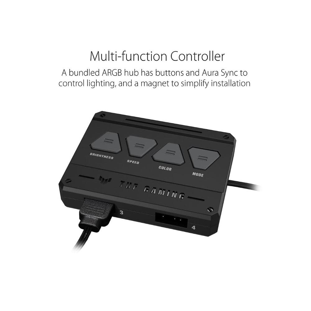 - A bundled ARGB hub connects up to four fans and features onboard lighting control and Aura Sync support.