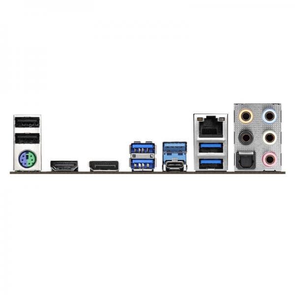 | Rear Panel I/O | - 1 x PS/2 Mouse/Keyboard Port- 1 x HDMI Port- 1 x DisplayPort 1.2- 1 x Optical SPDIF Out Port- 2 x USB 2.0 Ports (Supports ESD Protection)- 1 x USB 3.1 Gen2 Type-A Port (10 Gb/s) (Supports ESD Protection)- 1 x USB 3.1 Gen2 Type-C Port (10 Gb/s) (Supports ESD Protection)- 4 x USB 3.1 Gen1 Ports (Supports ESD Protection)- 1 x RJ-45 LAN Port with LED (ACT/LINK LED and SPEED LED)- HD Audio Jacks: Rear Speaker / Central / Bass / Line in / Front Speaker / Microphone (Gold Audio Jacks) |