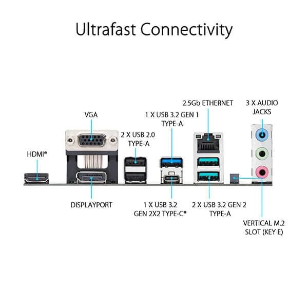 1 x USB 3.2 Gen 2x2 port (1 x USB Type-C®) 2 x USB 3.2 Gen 2 ports (2 x Type-A) 1 x USB 3.2 Gen 1 port (1 x Type-A) 2 x USB 2.0 ports (2 x Type-A) 1 x DisplayPort 1 x VGA port 1 x HDMI® port 1 x Vertical M.2 slot (Key E) 1 x Realtek 2.5Gb Ethernet port 3 x Audio jacks |