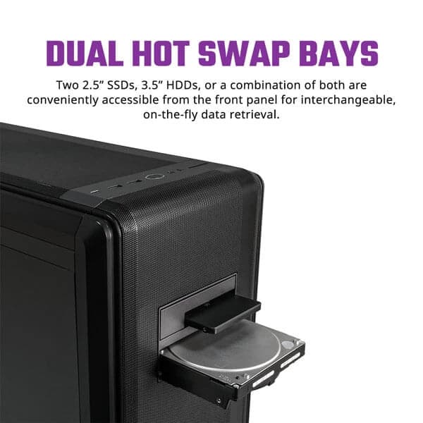 Two 2.5” SSDs, 3.5” HDDs, or a combination of both are conveniently accessible from the front panel for interchangeable, on-the-fly data retrieval.