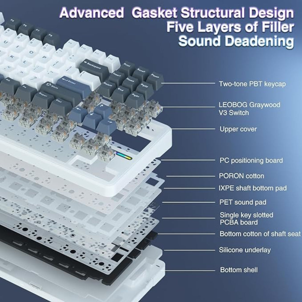 This gaming keyboard supports 3-pin/5-pin hot-swappable, which makes it easier to DIY your personalized mechanical gaming keyboard. The PC keyboard uses pre-lubricated LEOBOG Graywood V3 Switch for more precise and smooth tapping, and does not cause program conflicts when pressing multiple keys at the same time. With programmable drivers, the custom keyboard allows you to set shortcuts and key combinations according to your usage habits.