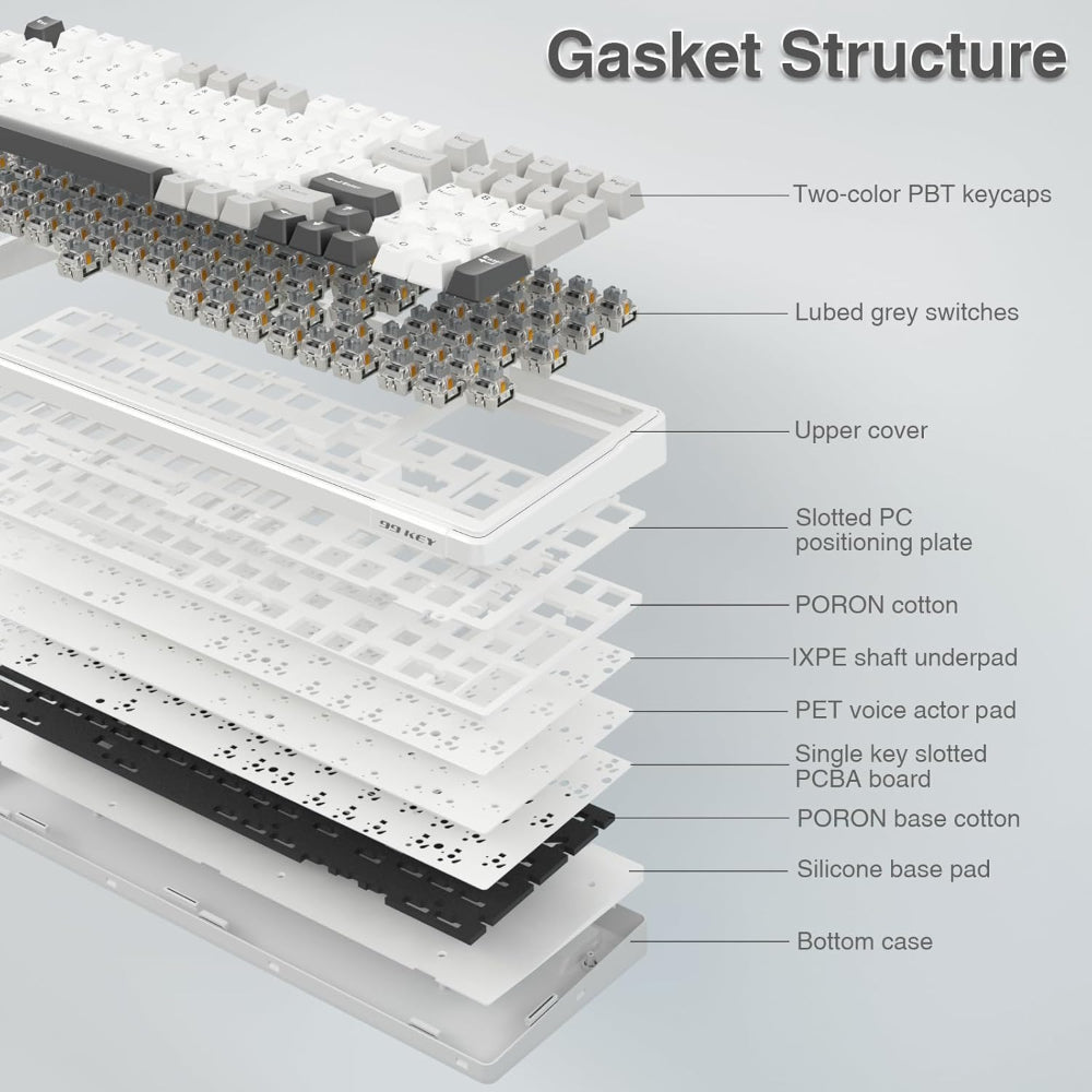 This computer keyboard features a gasket structure, extended integrated silicone pad, and PCB single key slotting, better optimizes resilience and stability, making the hand feel softer and more elastic. Five layers of filling silencer fills the gap between the PCB, the positioning plate and the shaft, effectively counteracting the cavity noise sound of the shaft hitting the positioning plate, and providing a solid feel.