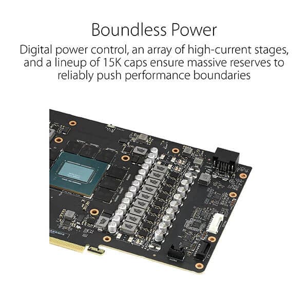 Digital power control, an array of high-current power stages, and a lineup of 15K caps ensure massive reserves to reliably push performance boundaries.