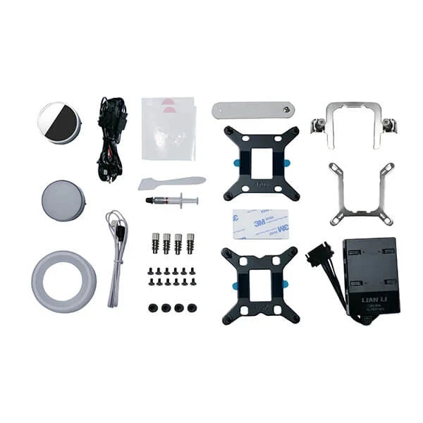 An aluminum housing cap with duo infinity mirror rings and a Lian Li logo at the center.