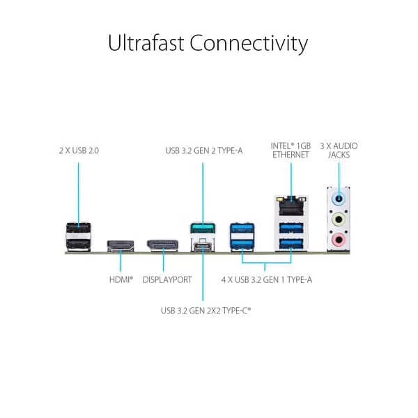 1 x USB 3.2 Gen 2x2 port (1 x USB Type-C®) 1 x USB 3.2 Gen 2 port (1 x Type-A) 4 x USB 3.2 Gen 1 ports (4 x Type-A) 2 x USB 2.0 ports (2 x Type-A) 1 x DisplayPort 1 x HDMI® port 1 x Intel® 1Gb Ethernet port 3 x Audio jacks |