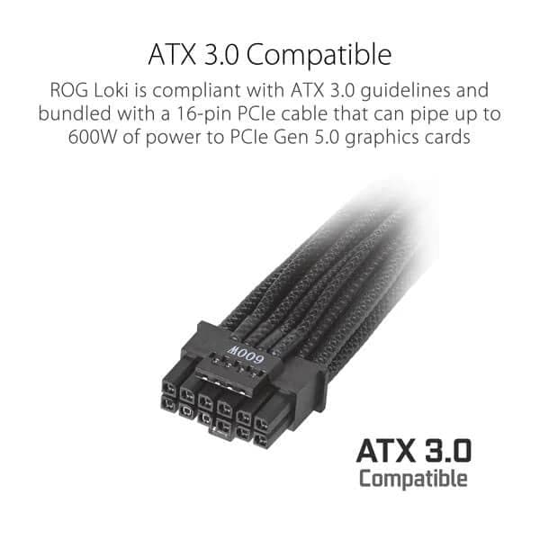 The latest power specification updates have landed. ATX 3.0 ushers in tighter voltage and current regulation guidelines for next-gen hardware - and ROG Loki steps ahead of the curve by being fully compliant. A 16-pin PCIe cable ripe for piping up to 600W of power to PCIe Gen 5.0 graphics cards is bundled with the PSU, bringing large-scale capabilities to SFF rigs.
