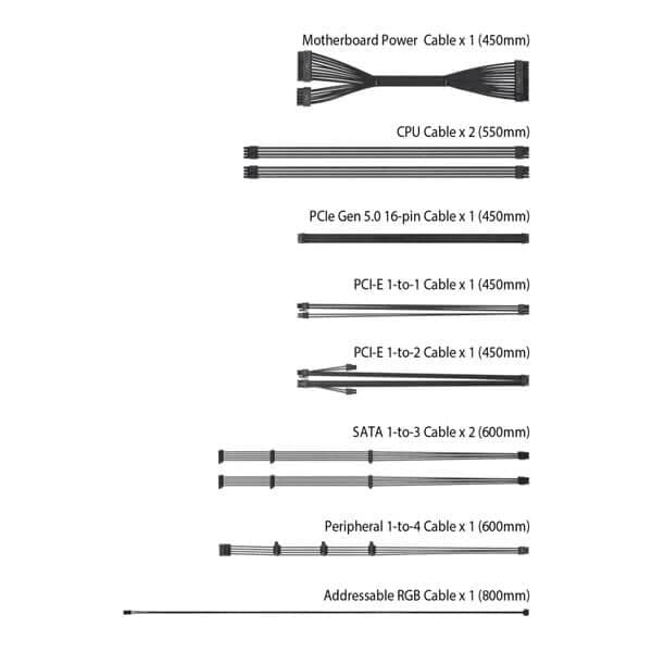 Motherboard Power Cable x 1 (450mm) CPU Cable x 2 (550mm) PCI-E Gen 5 16-pin Cable x 1 (450mm) PCI-E 1-to-1 Cable x 1 (450mm) PCI-E 1-to-2 Cable x 1 (450mm) SATA 1-to-3 Cable x 2 (300+200+100mm) Peripheral 1-to-4 Cable x 1 (300+100+100+100mm) Addressable RGB Cable x 1 (800mm) User Manual x 1 ATX to SFX adapter bracket x 1 |