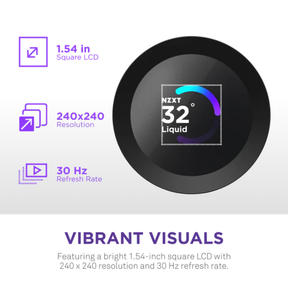 Show real-time temps, custom images, GIFs, and web integrations like Spotify and YouTube — all on a vibrant 1.54-inch square LCD, fully controlled through NZXT CAM.