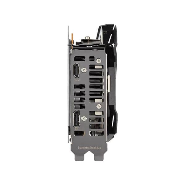 The underside of the card reveals further improvements. Most of the rear is swathed in a protective metal backplate that prominently features a wide vent. The vent allows hot air to escape towards chassis exhaust fans instead of being recycled back into the GPU cooler. Stainless steel is used for the I/O bracket to protect ports and provide a more secure mount. And a conveniently placed Dual Bios switch allows customization of the card’s default performance profile without software.