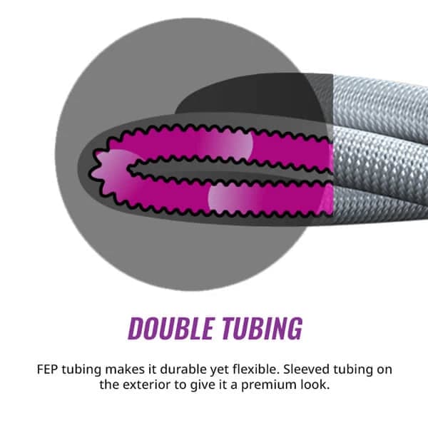 FEP tubing makes it durable yet flexible. Sleeved tubing on the exterior to give it a premium look.