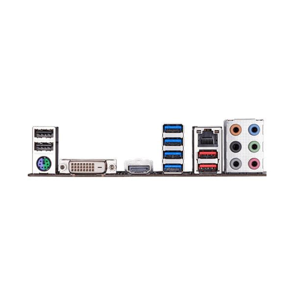 1 x PS/2 keyboard/mouse port 2 x USB 2.0/1.1 ports 1 x DVI-D port 1 x HDMI port 4 x USB 3.1 Gen 1 ports 1 x RJ-45 port 2 x USB 3.1 Gen 2 Type-A ports (red) 6 x audio jacks |