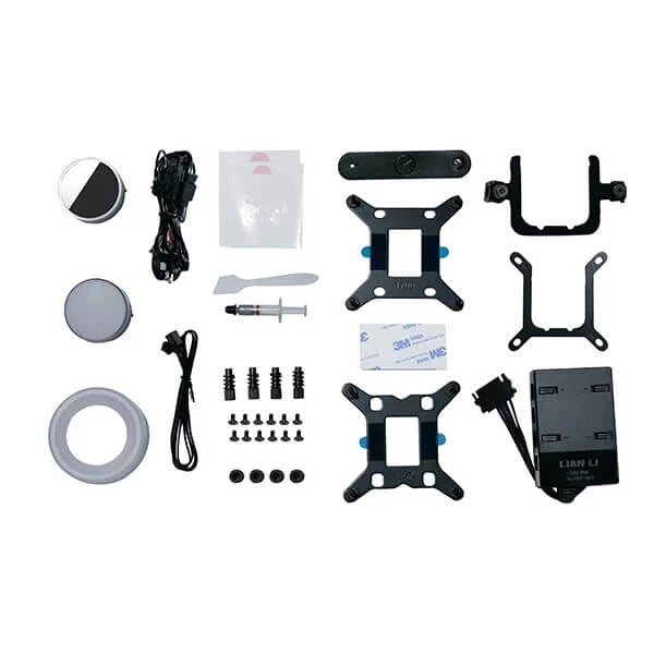An aluminum housing cap with duo infinity mirror rings and a Lian Li logo at the center.