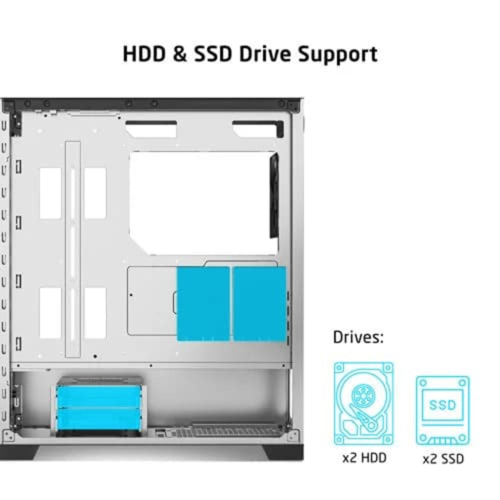 The A1828 Case accommodates up to 2 SSDs and 2 HDDs, offering a variety of storage options for flexible PC configurations.