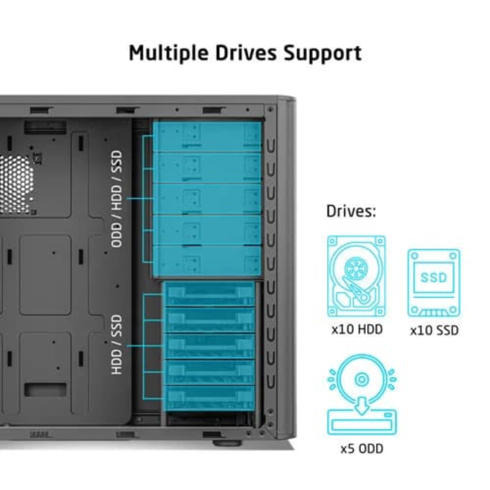 | Drive Bays (3.5″/2.5″/5.25″) | 10/10/5 |