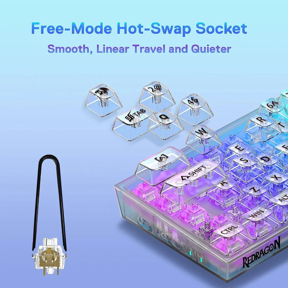 The transformative innovation with 99.8%+ switches compatible free-mod hot swappable Redragon K631 keyboard is available now. The unique exclusive structure design of the socket makes the switch mounting easier and less wobbling.