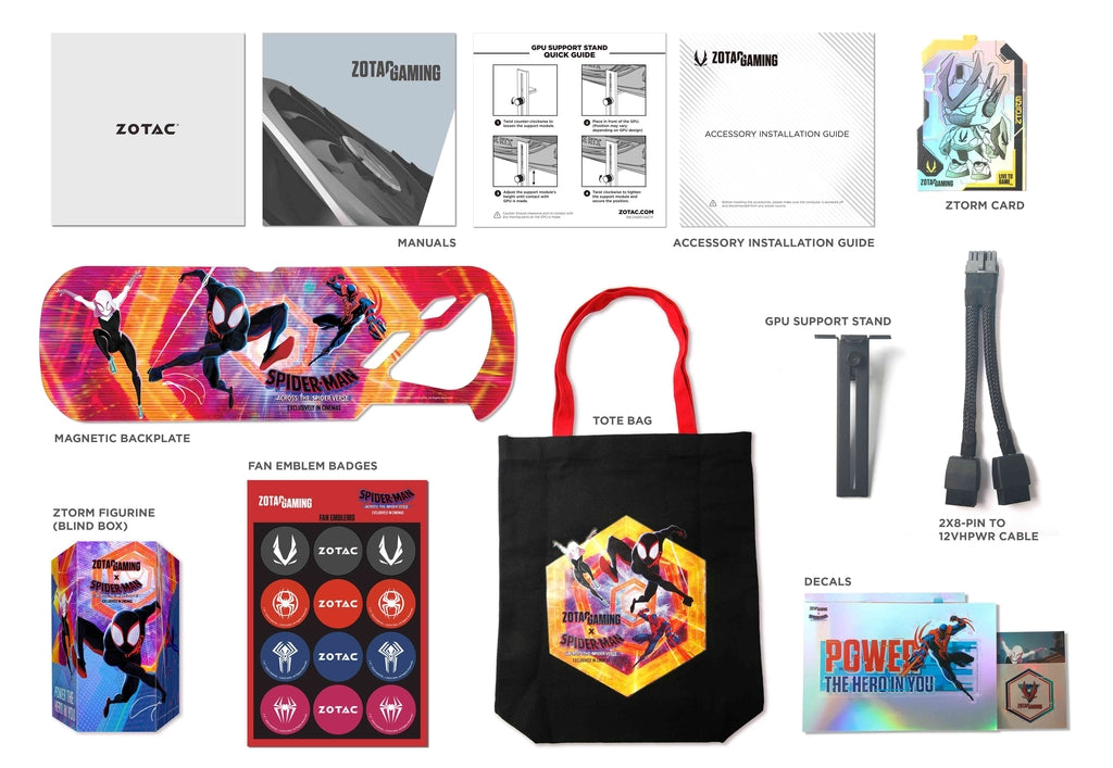 | Accessories | GPU Support Stand 1 x 2×8-pin-to-12VHPWR cable User Manual Themed Magnetic Backplate Themed Fan Emblems ZTORM Figurine Blind Box Tote Bag Decals |